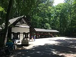 The park offers many recreation facilities, including miniature golf, a carousel, a miniature train, an ice cream parlor, a fishing pier, campgrounds, and numerous playgrounds and picnic areas.[2] Around the lake is a 4.68 mile (7.53 km) unpaved trail that is suitable for both cyclists and pedestrians.