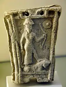 The relief is a terracotta (fired clay) plaque, 50 by 37 centimetres (20 in × 15 in) large, 2 to 3 centimetres (0.79 to 1.18 in) thick, with the head of the figure projecting 4.5 centimetres (1.8 in) from the surface. To manufacture the relief, clay with small calcareous inclusions was mixed with chaff; visible folds and fissures suggest the material was quite stiff when being worked.[7] The British Museum's Department of Scientific Research reports, "it would seem likely that the whole plaque was moulded" with subsequent modelling of some details and addition of others, such as the rod-and-ring symbols, the tresses of hair and the eyes of the owls.[8] The relief was then burnished and polished, and further details were incised with a pointed tool. Firing burned out the chaff, leaving characteristic voids and the pitted surface we see now; Curtis and Collon believe the surface would have appeared smoothed by ochre paint in antiquity.[9]