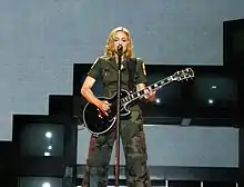 For 2004's Re-Invention World Tour, it was performed in a rock-style version with the singer playing a black Gibson Les Paul electric guitar.[57] She was dressed in military fatigues while the screens behind her depicted scenes of war and sex which, according to The New York Times' Kelefa Sanneh, look liked they were filmed with a camcorder and were reminiscent of the prisons in Abu Ghraib.[58] The Daily Herald's Mark Guarino praised Madonna's ability to "transform the song's original adolescent whine into adult certitude";[59] Neva Chonin, writing for the San Francisco Chronicle, deemed the performance a "singer-songwriter spotlight as Madonna showed off her competent guitar skills".[60]
