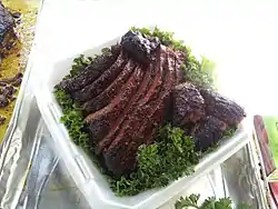 Burnt ends are flavorful pieces of meat cut from the "point" half of a smoked brisket.[1] When brisket muscles are separated, the lean "first cut" or "flat cut" is the deep pectoral, while the fattier "point", also known as the "second cut", "fat end", or "triangular cut", is the superficial pectoral. A traditional part of Texas barbecue, burnt ends are considered a delicacy in barbecue cooking. Either the entire brisket is cooked whole, then the point end removed and cooked further, or the point and flat are separated prior to cooking. Due to the higher fat content of the brisket point, it takes longer to fully cook to tender and render out fat and collagen. This longer cooking gave rise to the name "burnt ends". Sometimes when the flat is done, the point is returned to the smoker for further cooking. Some cooks re-season the point at this time.
