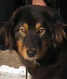 Buryat-Mongolian Wolfhounds are a large, formidable breed with either a short or long coat in red, black, and black and tan. Darker dogs with light spots above the eyes are preferred, these are known as Mongolian Four Eye Dogs. The distinct markings help to distinguish dogs from wolves in low light conditions and Mongolian legend states that these dogs can see into the spirit world.[7] Despite their size, they should be athletic, fast, cheerful, energetic, courageous and tireless dogs. In Buryat, they are called "hotosho", which means "yard wolf," and in Mongolian they are called "bankhar" meaning "chubby, fat, fluffy." Despite this second name, Buryat-Mongolian Wolfdogs are not a fat breed, just big a 50-60 kilograms (110-132 lbs) with a height of up to 75 centimeters (29.5 inches.)[1] Buryat-Mongolian Wolfhounds have low calorie needs for their size.[7] Despite their appearances, Buryat-Mongolian Wolfhounds are only distantly related to the larger Tibetan Mastiff.[7]