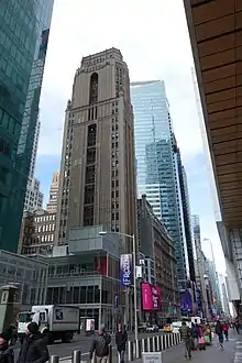 During April 1916, the Bush Terminal Company signed a long-term lease for vacant property at 132–134 West 42nd Street.[53][54] The plot extended the depth of the block, with 50 feet (15 m) of frontage on 42nd Street and 25 feet (7.6 m) on 41st Street. The Bush Terminal Company then announced plans for a 25-story showroom skyscraper on the site, to be designed by Helmle and Corbett.[54][55] This site, near Times Square, was "one of the most central in the city" as described by the Real Estate Record and Guide.[54] Furthermore, the proximity of Times Square's Theater District allowed tenants and visitors of the Exhibition Building and Buyers' Club to partake in leisurely activity.[49] The plans were modified that June, bringing the building to 29 stories.[56][57][lower-alpha 3]