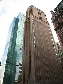 The Bush Tower was the city's first skyscraper to be constructed following the passage of the 1916 Zoning Resolution.[2][13] Because the zoning ordinance greatly restricted the massing of buildings, it was characterized by contemporary writers as possibly the last skyscraper to ever be built in New York City.[14][15][16] Instead, it came to impact the designs of other skyscrapers with setbacks (see Bush Tower § Impact).[14] Even though several other architects at the time believed that the plans may have been adjusted in response to the 1916 Zoning Resolution, Corbett wrote that the inclusion of setbacks at the Bush Tower was part of the original design, which predated the resolution.[17][18] The design for the massing was characterized by Fiske Kimball as being like an "arrow".[19]