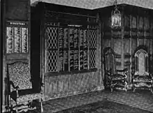 Decorative features of the first through third stories included sculptural grotesques on some of the column capitals, including carvings of a manufacturer, bookbinder, and the ancient god of trade Mercury. The ceiling beams were intended to resemble "old oak timbers" with their close spacing.[29] These lowest floors featured extensive oak paneling, oriental carpets, and antique furniture, similar to those in an old English manor house.[28][46][47] According to the company's published promotional literature, this style gave one "the feeling of having entered a hundred-year-old tavern".[27]