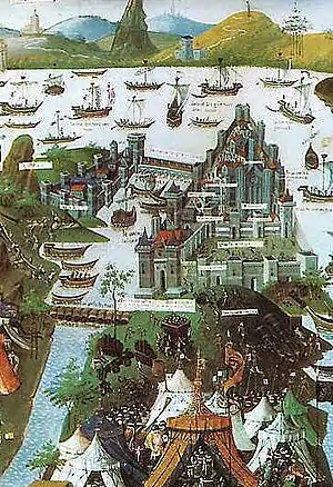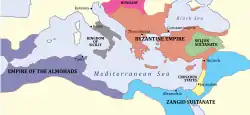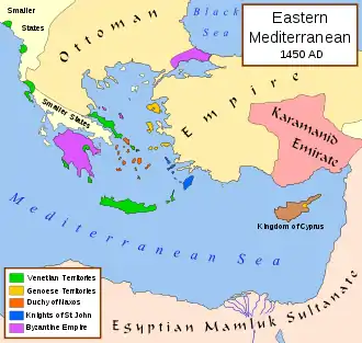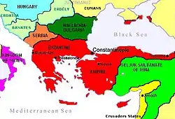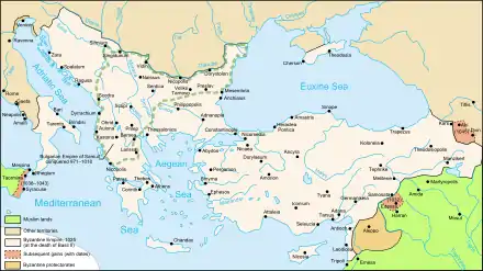 2. ^ Between 1204 and 1261 there was an interregnum when the Latin Empire took control of Constantinople, causing the Byzantine Empire itself to be divided into the Empire of Nicaea, the Empire of Trebizond and the Despotate of Epirus. The Empire of Nicaea is considered by historians to be the legitimate continuation of the Byzantine Empire because it managed to retake Constantinople.