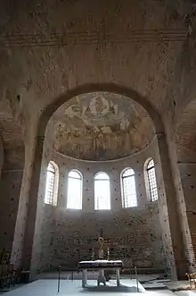 Major churches dating to this period include Hagia Eirene in Constantinople, which was rebuilt in the 760s following its destruction by the 740 Constantinople earthquake. The interior of Hagia Eirene, which is dominated by a large mosaic cross in the apse, is one of the best-preserved examples of iconoclastic church decoration.[59] The church of Hagia Sophia in Thessaloniki was also rebuilt in the late 8th century.[60]