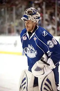 On July 20, 2010, Desjardins re-signed to a one-year contract with the Canadiens.[5] However, on August 16, 2010, he was traded by the Canadiens to the Tampa Bay Lightning for Karri Rämö.[6] On December 30, 2010, he started his first NHL game, playing against the Canadiens. He recorded a win, stopping 27 of 28 shots for a 4-1 Lightning victory.[7]