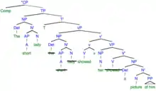The notion of c-command can be found in frameworks such as Binding Theory, which shows the syntactic relationship between pronouns and its antecedent.[4] The binding theory framework was first introduced by Chomsky in 1973 in relation to the treatment of various anaphoric phenomena, and has since been revised throughout the years. Chomsky's analysis places a constraint on the relationship between a pronoun and a variable antecedent. As such, a variable cannot be the antecedent of a pronoun to its left.