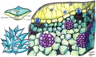 Observations relating to CAM were first made by de Saussure in 1804 in his Recherches Chimiques sur la Végétation.[2] Benjamin Heyne in 1812 noted that Bryophyllum leaves in India were acidic in the morning and tasteless by afternoon.[3] These observations were studied further and refined by Aubert, E. in 1892 in his Recherches physiologiques sur les plantes grasses and expounded upon by Richards, H. M. 1915 in Acidity and Gas Interchange in Cacti, Carnegie Institution. The term CAM may have been coined by Ranson and Thomas in 1940, but they were not the first to discover this cycle. It was observed by the botanists Ranson and Thomas, in the succulent family Crassulaceae (which includes jade plants and Sedum).[4] Its name refers to acid metabolism in Crassulaceae, not the metabolism of "crassulacean acid", a nonexistent chemical entity.