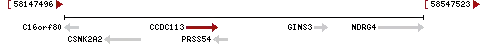 CCDC113, located between nucleotides 58283840 and 58317740 on chromosome 16, is surrounded between antisense genes PRSS54 and CSNK2A2 and downstream from GINS3 and NDRG4 on the sense strand. PRSS54 is a trypsin-like serine protease which codes for the inactive serine protease 54 precursor.[10] CSNK2A2 the casein kinase 2, alpha prime polypeptide contains a protein kinase domain and a catalytic domain.[11] GINS3 is essential for the initiation of DNA replication and replisome progression in eukaryotes.[12] NDRG4 a member of the N-myc downregulated gene family belonging to the alpha/beta hydrolase superfamily which encodes a cytoplasmic protein responsible for cell cycle progression and survival in primary astrocytes and may be involved in regulation of mitogenic signaling in vascular smooth muscle cells.[13]