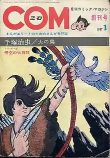 COM (コム, Komu) was a manga magazine started in January 1967 by Osamu Tezuka.[1] It was started in response to the success of Garo (which at that time was around its highest circulation), and as a way for Tezuka and other artists to showcase more avant-garde and experimental works in manga.[2] The first seven stories of Phoenix were the most famous work to be published from this anthology before it went under in 1972. In addition, the famous feminist cartoonist Murasaki Yamada got her start working for this anthology.