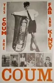 COUM Transmissions was a music and performance art collective who operated in the United Kingdom from 1969 through to 1976. The collective was influenced by the Dada and surrealism artistic movements, the writers of the Beat Generation, and underground music.[1] COUM were openly confrontational and subversive, challenging aspects of conventional British society. Founded in Hull, Yorkshire by Genesis P-Orridge, other prominent early members included Cosey Fanni Tutti and Spydeee Gasmantell (also at school with Genesis P-Orridge). Part-time members included Tim Poston, "Brook" Menzies, Haydn Robb, Les Maull (aka The Reverend Lelli), Ray Harvey, John Smith (aka Jonji Smith), Foxtrot Echo, Fizzy Paet and John Gunni Busck (John Lacey). Later members included Peter "Sleazy" Christopherson and Chris Carter, who together with P-Orridge and Fanni Tutti went on to found the pioneering industrial band Throbbing Gristle in 1976.