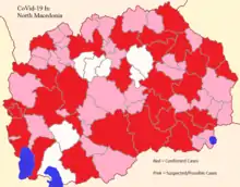 The COVID-19 pandemic in North Macedonia is part of the ongoing worldwide pandemic of coronavirus disease 2019 (COVID-19) caused by severe acute respiratory syndrome coronavirus 2 (SARS-CoV-2). The virus was confirmed to have reached North Macedonia in February 2020.[3] The initial contagion in the country was mainly connected with the COVID-19 pandemic in Italy as there are circa 70,000 residents[4] of Italy from North Macedonia and resulted in many people returning to North Macedonia, bringing the virus with them.[5] As of 9 July, over 7,000 cases have been confirmed in the country, due to its second wave caused by family reunions during Eid al-Fitr among the Muslim minority and the overall re-opening of the country to organize the parliamentary elections.[6][7][8]