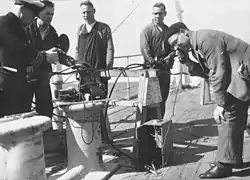 Faraday carried out a number of cable laying and surveying exercises both in home waters and the Pacific until 1939.[1] Among the operations was the 1935 laying of the Bass Strait telephone cable to connect Victoria with Tasmania with six telephone and about twelve telegraph circuits with a single broadcasting circuit. The cable was a new type carrying the signal over a single wire described as a central conductor separated from another composed of "five copper tapes, which are insulated from the central copper conductor wire by a new substance known as “paragutta,” and covered again by a coating of the same material." — an early coaxial cable.[8]