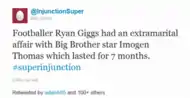 On 8 May 2011, an account on social networking site Twitter was created under the name "Billy Jones", and posted the alleged details of several of the anonymised privacy injunctions that had been mentioned in the media.[10] This included the claim that the married footballer known as CTB had been involved in a seven-month extra-marital relationship with model Imogen Thomas. While Thomas could be named in the UK media, the identity of CTB could not.[11] On the same date, messages saying that the identity of claimant CTB was Manchester United player Ryan Giggs were posted on Twitter and subsequently reported in a number of non-UK media sources.[12][13] The allegations were repeatedly reposted online by other users, in a similar response to that of the Twitter Joke Trial the year before.[14][15]