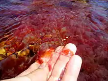 Caño Cristales ([ˈka.ɲo kɾisˈt̪ales]; English: Crystal Channel) is a Colombian river located in the Serrania de la Macarena province of Meta, and is a tributary of the Guayabero River. It was found in 1969, by a group of cattle farmers. The river is commonly called the "River of Five Colors" or the "Liquid Rainbow," and is noted for its striking colors.[1][2] The bed of the river from the end of July through November is variously colored yellow, green, blue, black, and especially red, the last caused by Macarenia clavigera plants (family Podostemaceae) on the riverbed.[3]