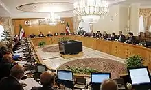 The Cabinet of Iran (Persian: هیئتدولت ایران, Heyatedovlat-e Iran) is a formal body composed of government officials, ministers, chosen and led by a President. Its composition must be approved by a vote in the Parliament. According to the Constitution of the Islamic Republic of Iran, the President may dismiss members of the cabinet, but must do so in writing, and new appointees must again be approved by the Parliament. The cabinet meets weekly on Saturdays in Tehran. There may be additional meetings if circumstances require it. The president chairs the meetings. The Supreme Leader (Ali Khamenei) has the power to dismiss cabinet members like ministers and vice presidents, as well as the President, at any time, regardless of the Parliament's decisions.