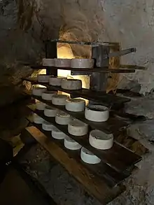The milk is first heated and curdled by the addition of rennet. The whey is removed from the curds, which are then packed into cylindrical molds called arnios, salted and left to cure and harden. After the initial curing period of around two weeks, the Cabrales is then aged a further two to five months in natural caves in the limestone mountains of the area. The cheeses are placed on wooden shelves known as talameras, where they are periodically turned and cleaned. Relative humidity in these caves is typically 90% and the temperature is a cool 7–13 °C (45–55 °F), conditions favoring the development of penicillium molds that produce blue-green veins throughout the cheese.[1]