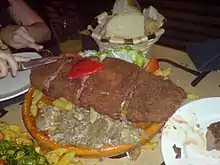 Cachopo is a dish characteristic of Asturian cuisine.[1] It consists of two large veal fillets and includes ham and cheese. The dish is eaten fried and hot after being breaded in eggs and breadcrumbs, and it is usually served garnished with potatoes, peppers, or mushrooms.[1]