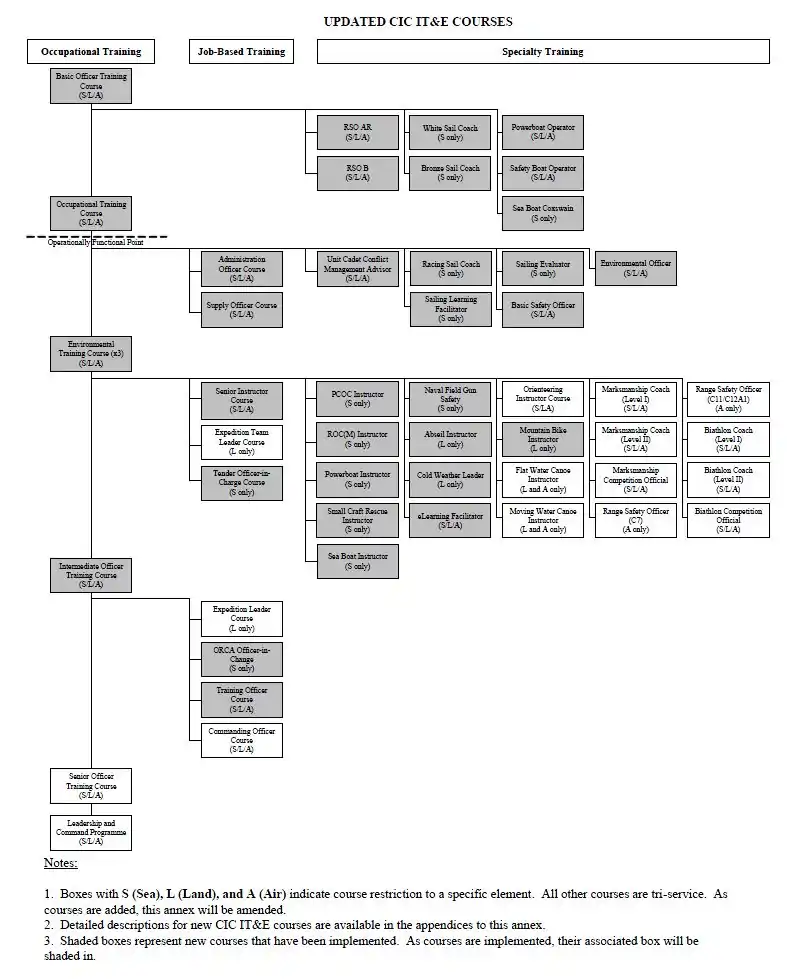 Candidates without previous military service are required to complete the Basic Officer Training Course (BOTC) within 5 years of enrolment, and with the consequent CIC Occupational Training Course (OTC), involve a total of seven weeks of distance learning and 16 days of in house training at Regional Cadet Instructor Schools (or Écoles régionale des instructeurs de cadets). A CIC officer will start at the rank of naval cadet or officer cadet, and upon successfully completing the Basic Officer Training and Occupational Training Courses may be commissioned after a year's service and on the job training or immediately if the candidate holds a university undergraduate degree.