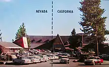 The Cal Neva Lodge and Casino overlooks Lake Tahoe with the property split across the California–Nevada border near Crystal Bay.[55][63] The main dining room has a white line indicating the state border running down the middle of the room.[64] The swimming pool also straddles the state border.[25] The interior is decorated in the lodge-style.[65] The entrance has been replaced several times over the years, although the exterior of the buildings have remained almost the same since the reconstruction.[66] Prior to the expansion under Sinatra, the lodge had 55 rooms and 11 lodges,[65] but this was increased to 220 lake-facing rooms following the expansion in 1969.[46][67] As of 1998, it had 182 rooms and suites and eight conference rooms, catering for up to 400 people.[57]