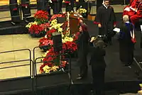 The project's large size had been questioned before construction began, including by a university consultant who recommended building the arena with 3,500 seats.[2] By April 2011 the university was reporting that construction costs on the center were $5.5 million over the original budget.[3] A "grand opening" concert by Kenny Rogers in April 2012 attracted only a half-capacity audience, leading to renewed questions about the scale and cost of the project.[2] In May 2012, university president Angelo Armenti was fired by the Pennsylvania State System of Higher Education Board of Governors; among the issues cited in reports of this action were concerns about the financing and financial impact of the convocation center.[4][5][6]