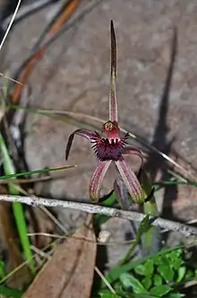 Tailed spider orchid is thought to be pollinated by the thynnid wasp, Lophocheilus villosus.[6][7]