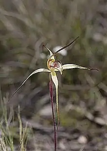 Fawn spider orchid usually grows in coastal scrub and heath in southern areas of Tasmania. Summer fires appear to encourage flowering.[2][4]