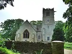 The Church of England parish church of St John the Baptist is in Caldecott Road between Caldecott and Chelveston. The earliest parts of the church are 13th-century, including the north tower. Part of the chancel is 14th-century. The south porch was built in 1635.[2] The arcades were rebuilt and the north aisle added in 1849–50 to designs by the architect E. F. Law.[3] The church is a Grade II* listed building.[2]