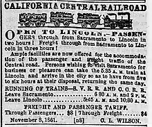 In 1862, California Central had two locomotives in service between Folsom and Lincoln — the "Lincoln" and the "Harry Wilson"— one in Sacramento yet to run — the "Garibaldi" — and one on order.[20] As the northern terminus of CCRR, the new town of Lincoln showed signs of growth.[21] Even so, CCRR was never able to complete its road to Marysville.