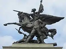 The central figure depicts Bellona, goddess of war, riding on the back of Pegasus, the winged horse.[8] (The 1906 San Francisco Call article reporting from the dedication ceremony describes the riding figure as Victory). There are two soldiers on the monument, one fallen, and one standing to the side armed with a pistol. One side of the pedestal is inscribed with the text "Erected by the Citizens of San Francisco in Honor of the California Volunteers, Spanish–American War, 1898. First to the Front."[3] The bronze figures are 16 feet (4.9 m) tall and 10 feet (3.0 m) long, mounted on a granite base another 10 feet (3.0 m) tall.[8]