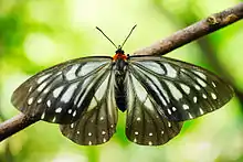 The upperside ground colour is fuliginous (sooty) black with the veins prominently black. Forewings and hindwings with the following white markings, sometimes slightly tinged with cream colour. Forewing: basal half of cell; a transverse spot at its apex; basal two-thirds of interspace 1 a small diffuse spot at bases of interspaces 4 and 5; a discal transverse series of elongate spots from interspace 2 to costa, becoming slender streaks in interspaces 9 and 10; and a postdiscal series of more rounded spots, minute in interspaces 7 and 8. The elongate white mark in interspace 1 traversed by a slender black streak. Hindwing with the following similar while markings: The dorsal margin broadly up to vein 1; the basal half of interspace 1; nearly the whole of the discoidal cell; spots at base of interspaces 4, 5, 6, and 7; an upper discal transverse series of four elongate spots, and a postdiscal similar series of more rounded smaller spots. Underside: forewing pale fuliginous black; white markings as on the upperside, but larger, more diffuse. Hindwing: ground colour ochraceous; white markings as on the upperside, but interspaces 1 a and 1 strongly tinged with ochraceous; discal and postdiscal series of six, not four, spots each; veins chestnut-brown. Antennae, head, thorax posteriorly and abdomen black; pronotum and mesonotum anteriorly and on the sides with crimson pubescence; beneath, antennae, head, thorax and abdomen black.[1]