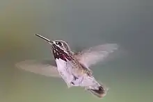 During courtship, a male calliope hummingbird hovers at accelerated wingbeat frequency up to 95 flaps per second (42% higher than normal hovering), creating a loud buzzing sound, with throat feathers protruding and facing a female.[4][9] The male then ascends temporarily to 20 meters and dives at high speed, with the rapid descent causing sonation of wing and tail feathers combined with vocalization, intending to attract attention of the female.[9] Research in a wind tunnel demonstrated that the male courtship display includes sounds produced by three independent feather or vocal components, each with different acoustic characteristics, thus potentially containing different messages appealing to the female.[9] The tail feathers flutter at high frequency and hit each other to produce the buzzing sound.[10]
