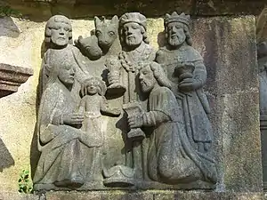 - The adoration of the Magi. The Virgin Mary sits holding the baby Jesus and Joseph is behind her. The first king is on his knees, has placed his crown on the ground and offers his present in a sort of square chalice. The other two kings stand, their crowns on their heads and hold vases containing their gifts. One's costume is completed by a small cross and type of coif whilst the other has a cord around his shoulders from which a cross is suspended. The cow and the ass are at Joseph's side.[6]