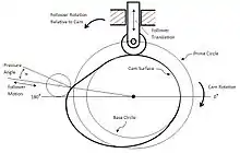 The most commonly used cam is the cam plate (also known as disc cam or radial cam[6]) which is cut out of a piece of flat metal or plate.[7] Here, the follower moves in a plane perpendicular to the axis of rotation of the camshaft.[8] Several key terms are relevant in such a construction of plate cams: base circle, prime circle (with radius equal to the sum of the follower radius and the base circle radius), pitch curve which is the radial curve traced out by applying the radial displacements away from the prime circle across all angles, and the lobe separation angle (LSA - the angle between two adjacent intake and exhaust cam lobes).