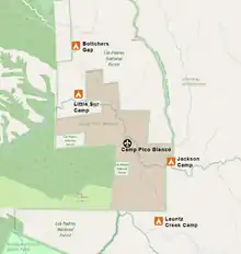 Camp Pico Blanco consists of a main camp and the satellite Pioneer Camp, about one-half mile downstream on the Little Sur River. There are twelve campsites in the main camp. Each site is numbered and named after a Native American tribe. The campsites can host up to about 300 Scouts and 50 leaders. Staff Hill hosts up to 50 staff members.[18][19]