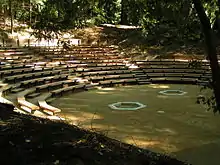 During 2009, the Lodge undertook a $40,000 project to rebuild the campfire bowl at Pico Blanco camp.[69] Originally constructed in 1954, the original half-round redwood logs used as seating had deteriorated and rotted away in many locations. Lodge member Mark Ellis drew plans to replace and expand the seating using steel posts.[70] The Lodge organized a number of work parties to excavate an expanded area for the campfire. They built and installed about 275 steel support posts to terrace the fire bowl and permanently support new seating. They also rebuilt the fence behind the campfire rings and the campfire rings themselves. The expanded amphitheater was rededicated in a ceremony attended by then-Chief Scout Executive Bob Mazzuca on July 16, 2011 and dedicated in his name. Mazzuca attended the camp as a youth.