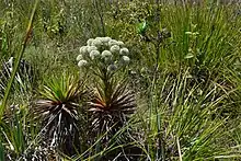 The campo rupestre ecoregion consists of a distinct set of habitats where open vegetation prevails and is subject to harsh climatic and pedological conditions. Rocky outcrops, grasslands and shrublands account for the most common habitats and are dominated by lineages such as Velloziaceae, Cyperaceae, Poaceae and Eriocaulaceae.[8] Although few plant families predominate in this ecoregion, species richness is high; the Espinhaço Range alone accounts for seven percent of the Brazilian flora, while all the mountain ranges comprising the entirety of campo rupestre harbor approximately 15% of Brazil's plant diversity.[2][9] The relatively high levels of diversity in the campo rupestre can be explained by the environmental requirements unique to each habitat (or micro-habitat), which vary according to a wide range in latitude and altitude.[10] Insularity can also foster diversity in the campos rupestres; given its discontinuous distribution across several mountain ranges overcoming long-distance dispersal can pose a challenge to many lineages.[11]