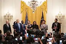 In April 2018, Kanye West tweeted "I love the way Candace Owens thinks."[37] The tweet was met with derision on the part of many of West's fans.[38] In May 2018, President Donald Trump said that Owens "is having a big impact on politics in our country. She represents an ever-expanding group of very smart 'thinkers', and it is wonderful to watch and hear the dialogue going on... so good for our Country!"[39] She registered as a Republican in 2018, after the hearings following Brett Kavanaugh's nomination as a Supreme Court judge. She objected to what she termed the "social lynching" of Kavanaugh, on the grounds that to "believe women" was the reason "our ancestors got lynched", as she told a journalist from Philadelphia magazine. "No evidence, but believe all women".[40]