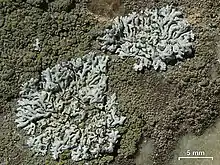 | Physcia dubia (large foliose lichen) alongside Candelariella antennaria (grey/yellow crustose lichen) | |