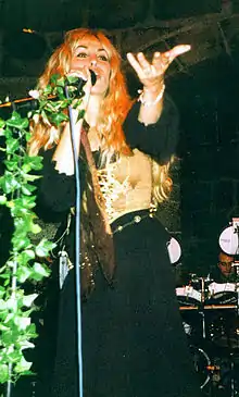 She was once a Rainbow fan,[6] so she met Ritchie Blackmore to ask him for an autograph in 1989.[7] They talked about ghosts, music, travel, history, and philosophy, gradually became friends, and then lived together from 1991.[8] She provided backing vocals on the instrumental track "Difficult to Cure" in 1993's European tour of Deep Purple.[9] She also provided singing backing vocals on "Ariel", "Black Masquerade", "Wolf to the Moon" and "Hall of the Mountain King" for Stranger in Us All, the CD by Rainbow, as well as writing lyrics for the four songs on the aforementioned album. Despite her being inexperienced as a professional lead singer, Blackmore encouraged her to become his musical partner. She then wrote lyrics for most of the songs on the first Blackmore's Night album, Shadow of the Moon where she supplied lead vocals. Those songs were written with her voice in his mind.[10]