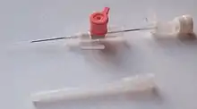 A cannula (/ˈkænjʊlə/; Latin meaning 'little reed'; plural cannulae or cannulas)[1] is a tube that can be inserted into the body, often for the delivery or removal of fluid or for the gathering of samples. In simple terms, a cannula can surround the inner or outer surfaces of a trocar needle thus extending the effective needle length by at least half the length of the original needle. Its size mainly ranges from 14 to 24 gauge. Different-sized cannula have different colours as coded.