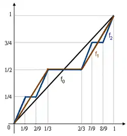 It is also referred to as the Cantor ternary function, the Lebesgue function,[1] Lebesgue's singular function, the Cantor–Vitali function, the Devil's staircase,[2] the Cantor staircase function,[3] and the Cantor–Lebesgue function.[4] Georg Cantor (1884) introduced the Cantor function and mentioned that Scheeffer pointed out that it was a counterexample to an extension of the fundamental theorem of calculus claimed by Harnack. The Cantor function was discussed and popularized by Scheeffer (1884), Lebesgue (1904) and Vitali (1905).