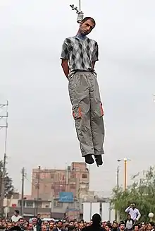 Capital punishment is a legal penalty in Iran.[2] Crimes punishable by death include murder; rape; child molestation; homosexuality; pedophilia; drug trafficking; armed robbery; kidnapping; terrorism; burglary; incestuous relationships; fornication; prohibited sexual relations; sodomy; sexual misconduct; prostitution;[3][4] plotting to overthrow the Islamic regime; political dissidence; sabotage; arson; rebellion; apostasy; adultery; blasphemy; extortion; counterfeiting; smuggling; speculating; disrupting production; recidivist consumption of alcohol; producing or preparing food, drink, cosmetics, or sanitary items that lead to death when consumed or used; producing and publishing pornography; using pornographic materials to solicit sex; recidivist false accusation of capital sexual offenses causing execution of an innocent person; recidivist theft; certain military offenses (e. g., cowardice, assisting the enemy); "waging war against God"; "spreading corruption on Earth"; espionage; and treason.[5][6] Iran carried out at least 977 executions in 2015, at least 567 executions in 2016,[7] and at least 507 executions in 2017.[8]