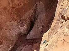 One of the most popular canyoneering routes in Capitol Reef National Park is Cassidy Arch Canyon. A paper by George Huddart, details the park's commitment to working with citizens to maintain the route as well as the vegetation and rocks.[37] The canyon route is approximately 2.3 miles long (0.4 miles of technical work), consisting of 8 different repels, and takes between 2.5 to 4.5 hours to complete.[38] The first repel, as noted in the Blue Gnome report, is 140ft, and descends below the famous Cassidy Arch.