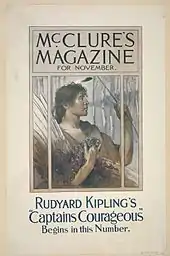 Captains Courageous is an 1897 novel, by Rudyard Kipling, that follows the adventures of fifteen-year-old Harvey Cheyne Jr., the spoiled son of a railroad tycoon, after he is saved from drowning by a Portuguese fisherman in the north Atlantic. The novel originally appeared as a serialisation in McClure's, beginning with the November 1896 edition with the last instalment appearing in May 1897. In that year it was then published in its entirety as a novel, first in the United States by Doubleday, and a month later in the United Kingdom by Macmillan.[1] It is Kipling's only novel set entirely in North America.[1] In 1900, Teddy Roosevelt extolled the book in his essay "What We Can Expect of the American Boy," praising Kipling for describing "in the liveliest way just what a boy should be and do."[3]