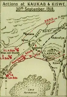 The 4th Cavalry Division rode out of Dilli on 30 September towards Kiswe 30 miles (48 km) away.[43] The bulk of the remnant Fourth Army was much closer to Damascus in two main columns; the first, consisting of the remnants of an Ottoman cavalry division and some infantry, was approaching Kiswe, 10 miles (16 km) south of Damascus with the second column some miles behind, closely followed by Arab forces.[46]