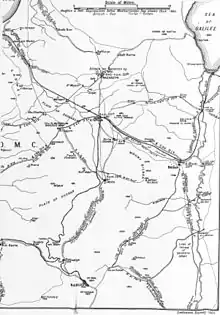 The Esdrealon Plain, also known as the Jezreel Valley, and the Plain of Armageddon, stretches to the white houses of Nazareth in the foothills of the Galilean Hills on its northern edge 10 miles (16 km) away, to Jenin on its southern edge at the foot of the Judean Hills, through Afulah to Beisan on its eastern edge, close to the Jordan River.[17] On its western edge near Lejjun, at the mouth of the Musmus Pass, the ancient fortress of Megiddo on Tell al Mutesellim, dominates the Esdrealon Plain, across which Romans, Mongols, Arabs, Crusaders and the army of Napoleon had marched and fought.[20] The road and railway network, on which the German and Ottoman forces in Palestine depended for supplies and communications, crossed this plain via the two important communication hubs of Afulah and Beisan. (See Falls Map 21 Cavalry advances detail)[21][22] The railway passed from the plain into the Judean Hills south of Jenin, to wind through a narrow pass in the foothills before climbing to Messudieh Junction, where it again branched. One line ran westward to Tulkarm and Eighth Army headquarters, before turning south to the railhead to supply the Eight Army front line troops on the coastal plain, while the main railway line continued south-eastward to Nablus, and the Seventh Army headquarters.[23]