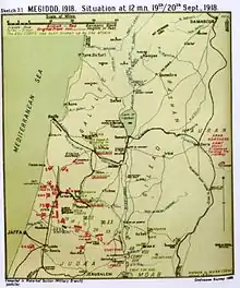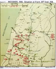 In preparation for the Battle of Megiddo, the Desert Mounted Corps, consisting of the 4th and 5th Cavalry Divisions, the Australian Mounted Division's 3rd and 4th Light Horse Brigades, concentrated near Ramleh, Ludd (Lydda), and Jaffa. Here dumps were formed of all surplus equipment, before the brigades and divisions moved up close behind the XXI Corps infantry divisions, near the Mediterranean coast.[3][4][5]