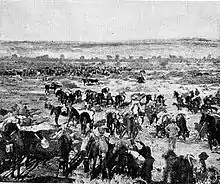 The advance from Beersheba came to a halt in December.[2][3] On 14 December Allenby reported to the War Cabinet that the rainy season would prevent any further operations, after Jerusalem was secured, for at least two months.[4] At this time, the Egyptian Expeditionary Force was paralysed by a breakdown in logistics forcing Allenby to send the Anzac and the Australian Mounted Divisions, along with the Imperial Camel Corps Brigade south of Gaza to shorten their lines of communication. He wrote: "I can't feed them, with certainty, and even now, a fortnight's heavy rain would bring me near starvation."[5] On 1 January, the 5th Mounted Brigade began moving back through the rain and slush followed by the 4th Light Horse Brigades Field Ambulance, beginning the Australian Mounted Division's journey back to Deir el Belah south of Gaza.[6] The Anzac Mounted Division did not move back quite so far; the 1st and possibly 2nd Light Horse Brigades moved back to Esdud while the New Zealand Mounted Rifles Brigade bivouacked near Ayun Kara (also known as Rishon LeZion) not far from Jaffa.[7][8]
